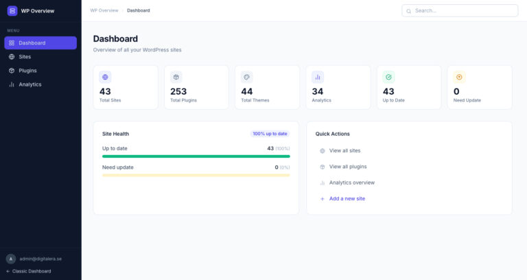 Vi har ett egenutvecklat system för att hålla koll på hälsostatusen på våra kunders webbplatser. Vi kan snabbt se vilka tema och plugins som körs och vilka versioner. När plugins får säkerhetsuppdateringar kan vi snabbt se vilka webbplatser som påverkas och uppdatera dem.
