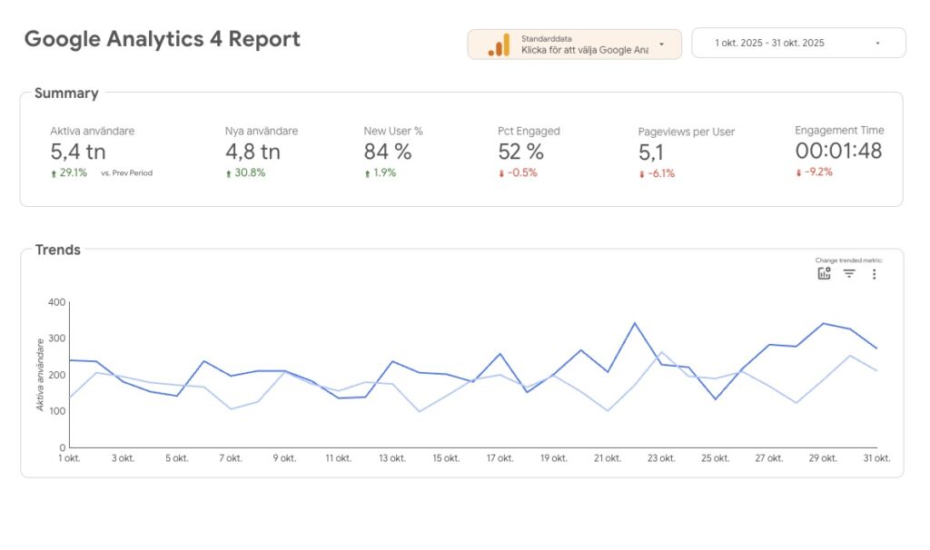 Vi vet att alla inte har tid eller vana att tolka siffror och grafer. Därför skapar vi rapporter som är tydliga, visuella och anpassade efter era mål – oavsett om det handlar om trafik, konverteringar eller kampanjresultat. Tillsammans går vi igenom vad som fungerar bra, vad som kan förbättras och hur ni kan utveckla er digitala närvaro framåt.