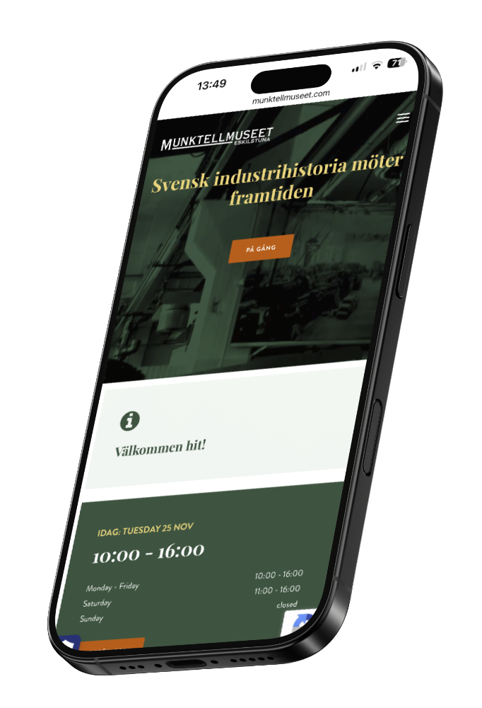 Våra vänner på aStory tog hand om den grafiska profilen och vi tog den vidare och byggde en ny modern webbplats i WordPress. Vi gjorde det lättare och snabbare för de olika målgrupperna att hitta relevant och anpassad information för dem. Vi gjorde det enkelt för kunden att lägga in aktuella öppettider som automatiskt visar dagens/veckans öppettider för besökaren. Munktellmuseet har ett enormt stort arkiv av gamla fina traktorer, maskiner, motorer och verktyg som vi lyfte fram i ett galleri med större bilder, tydligare fakta och enklare att filtrera. Vi översatte även webbplatsen till engelska då Munktellmuseet har många internationella besökare, både digitalt men förhoppningsvis även i framtiden när coronapandemin är över.