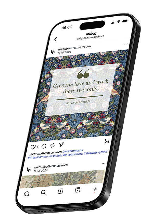 Unique Patterns är en licensagentur som representerar ikoniska designers, bland annat The William Morris Society i London. Vi är en digital partner som förutom att ha tagit fram deras webbplats, även har hittat sätt att återskapa och digitalisera gamla mönster från 1800-talet. Mönster som bara funnits nedskissade på papper, eller avbildade på gamla nötta tapetbitar, har återskapats och digitaliserats så att de går att använda för tryck igen.